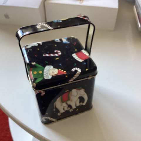 Jouluiset peltipurkit ja tarjotin