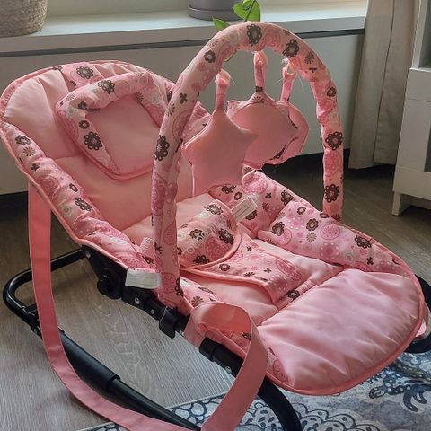Hyväkuntoinen ja tukeva sitteri lelukaarella sekä kantoremmeillä. Asentoa voi säätää keinuvaan tai paikallaan pysyvään. Helppo pitää puhtaana, kankaat voi pestä.