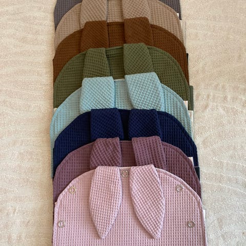 Vohvelikankaista ommeltu vauvan vaunuverhoja.