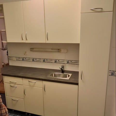 Nämä olleet pöytätason alapuolella, matalan ja täysikorkuisen kaapin rungot nostettu jaloilla irti maasta. Pesukoneen ja kuivurin kohdalla ei ole ollut runkoja vaan avoin tila.