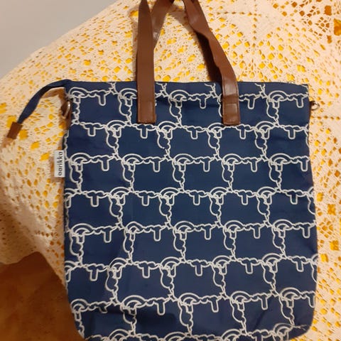 Tukeva ja siisti Aarikan kassi esim. pienille ostoksille tai kirjoille. Materiaali polyesteriä, on helppo pyyhkiä puhtaaksi. Sisällä vuorikangas ja vetoketjullinen tasku. Kangasosa on oikein hyväkuntoinen, mutta kahvoista huomaa, että laukku on ollut käytössä. Mitat ilman kahvoja noin 40 cm x 39 cm.