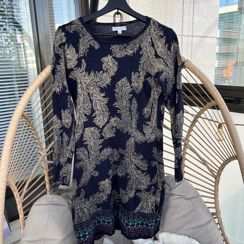 Moods of Norway merinoneule, lyhyt vetoketju kauluksessa. Farkun sininen, kaunis kuviointi myös selkäpuolella. Ihanan pehmeä. Hihassa erittäin siististi paikattu pieni kohta, näkyy toisessa kuvassa.