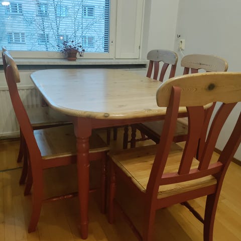 Myydään aika harvinainen kokonaisuus eli puusepällä mittatilauksena teetetty keittiön pöytä ja 6 tuolia.