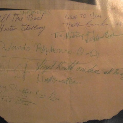 Oluessa uineessa kortissa Skatalites -yhtyeen nimikirjoitukset. Saatu Helsingissä keikan yhteydessä.