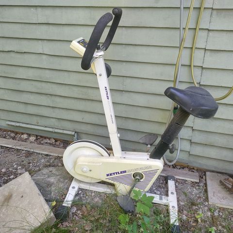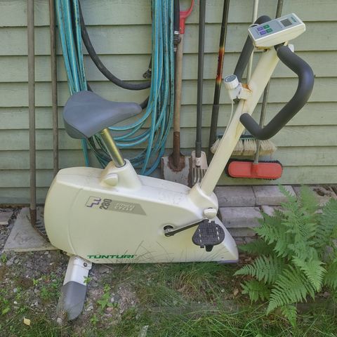 Kuntopyörä valkoisella rungolla ja mustalla satulalla sekä ohjaustangolla. Soveltuu sisäpyöräilyyn ja kuntoharjoitteluun.