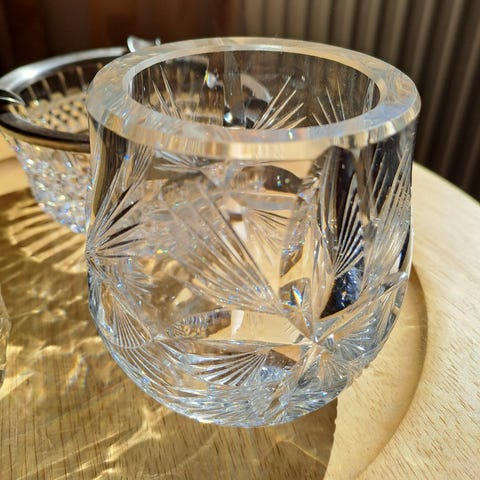 Vanhaa, paksua kristallilasia pieni rasia, pieni pullo ja pieni maljakko. Maljakon suulla pieni lohkeama. Maljakon korkeus noin 15 cm.