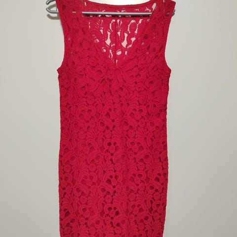 Punainen kaunis pitsimekko 3/4 hihoilla, koko lapussa 40, mutta vastaa mielestäni pikemminkin kokoa 38. Väri tummempi kuin kuvissa. Materiaali joustaa hitusen. Kerran käytetty, kunto kuin uusi. Kurikan keskustan alueella. Myynnissä myös muualla.