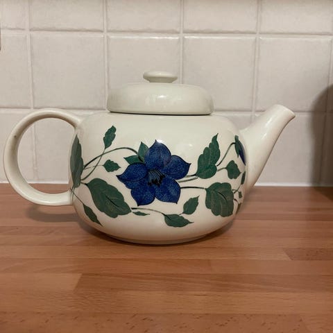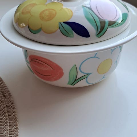 Hyväkuntoinen sinikukkainen kannellinen sokerikko. Korkeus n. 10 cm, leveys n. 10 cm. Vain nouto.