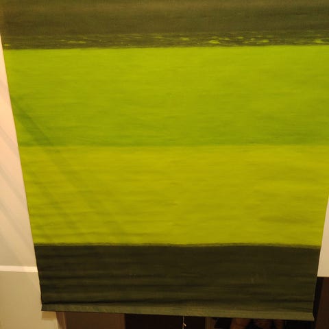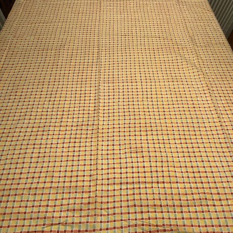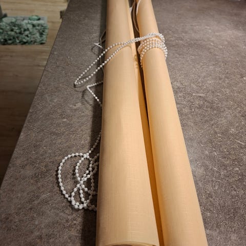 Kelta/oranssikukkaiset retro rullaverhot. Verhon leveys 140, korkeus 170cm + reunapitsi. Ripustangon leveys 144,5cm