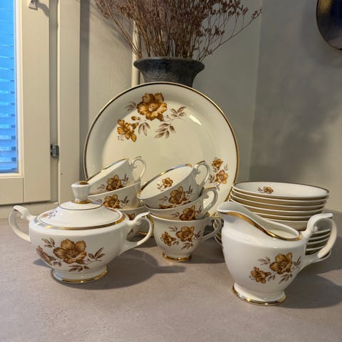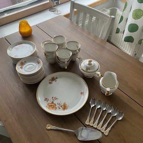 Myydään Arabian Myrna astiasto. Sisältää 9kpl kahvikuppi + tassi sekä lisäksi kermakko, sokerikko ja isompi kannu.