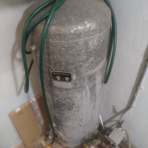 Myynnissä siisti ja hyväkuntoinen painesäiliö. Säiliö on noin metrin korkuinen, joten tilavuus arviolta 100–130 litraa. Ei ruostetta, ehjä ja jämäkkä – ollut varastoituna ja jää nyt turhaksi.