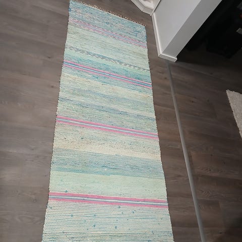 Hyvässä kunnossa, pitkä 315cm. Sini,vihreä, keltainen räsymatto. Vain haku.
