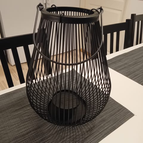 Musta metallinen kynttiläteline. Siisti kuntoinen. Korkeus n.30cm, leveys n.27 cm.