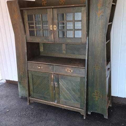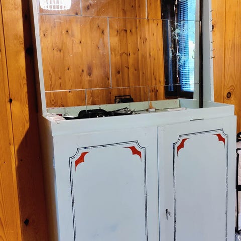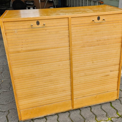 Punainen säilytyskaappi, jossa on kello. Kaapissa on useita hyllyjä ja ovi, joka avautuu säilytystilan paljastamiseksi. Sopii erilaiseen säilytykseen ja tilankäyttöön.