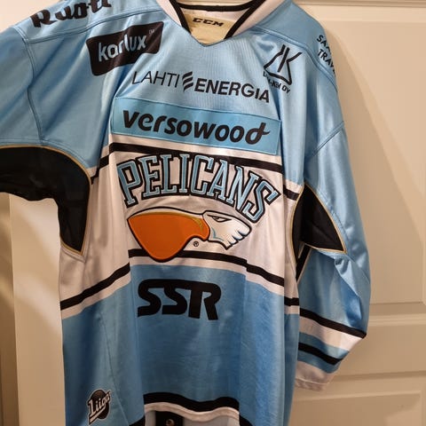 Pelicans Game Worn Pelipaita jääkiekkopaita, pääväriltään valkoinen, mustat ja siniset yksityiskohdat. Paidassa numerot 12 ja teksti EK. Koko:xxl