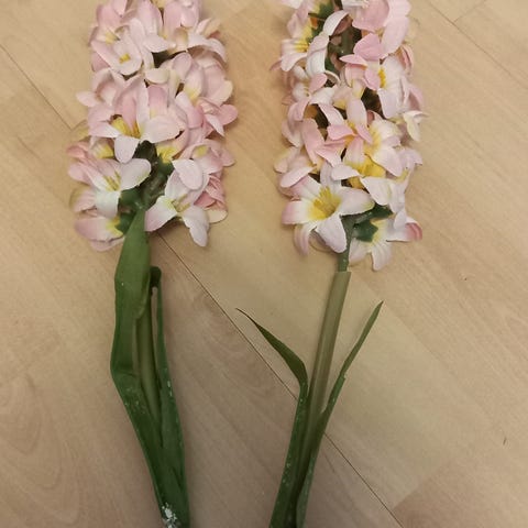 Männyn ja kuusenoksilla koristeltu sininen hyasintti. Lisänä valkoinen tekokukka ja koristevalot (mukana 2xAA paristot)