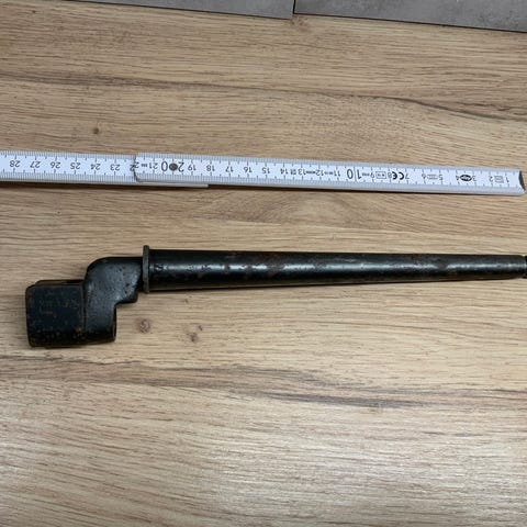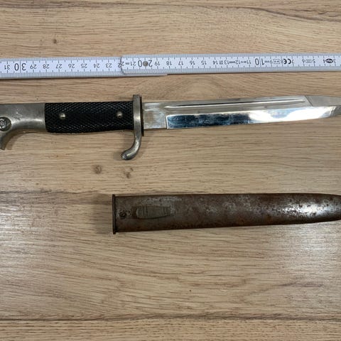 Antique bayonet stamped Gebr Heller 1938, complete with its original metal scabbard.