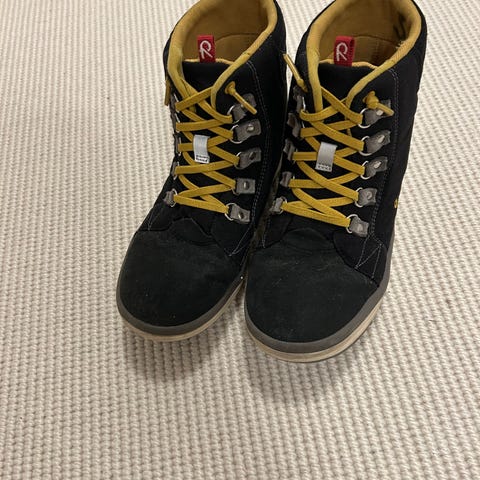 Reimatec kengät, koko 38, väri musta. Välikausikenkinä käytetty, mikseivät leudomman kelin talvikenkinäkin menisi. Yhden kauden mahtuivat jalkaan eikä muuta vikaa ole, kuin toisen kengän varren takaosassa oleva renksu on puoliksi irti. Toki normaalia käytössä tullutta jälkeä on, mutta renksu on ainoa varsinainen vika näissä. Kaiketi saisi siistittyä, mutta jäi tekemättä.