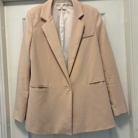 Klassikkokuvioinen satiini polyester pitkä blazer koko M. Tummansininen vuori. Hihansuissa halkiot. Todella näyttävä! Uuttavastaava!