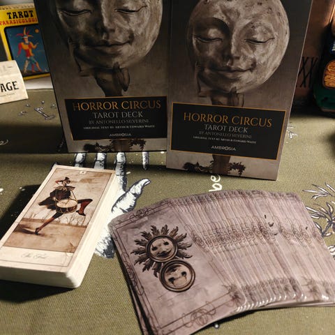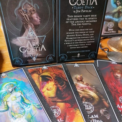 Goetia Demoni Tarot-pakka 73-korttia, joista yksi taiteilijan signeeraama, (Keräily editio-pakasta) ja 160-sivuinen värikuvitettu Käyttöopaskirja. Tämä on Kickstarterissa menestynyt tuote, jota ei ole saatavilla enää markkinoilla.