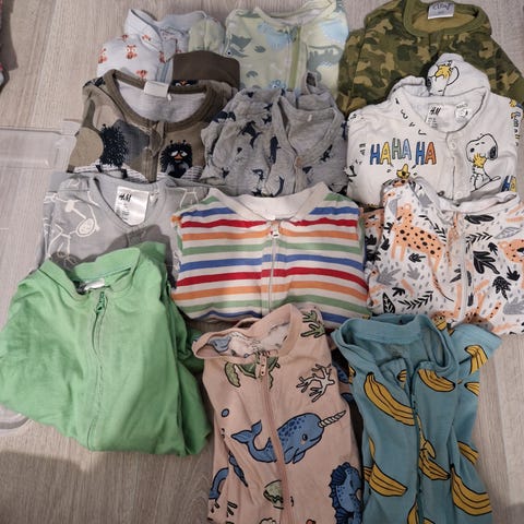 Setti 80 cm shortsihaalareita (romper) ja yksi pitkälahkeinen denimhaalari. Muumihaalarissa tummentumaa ja pinkkikuvioisessa haalarissa nyppyä.