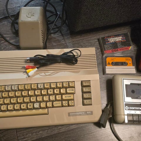 Commodore 64 kasettiasema ja tikku. Kuvan mukaiset.