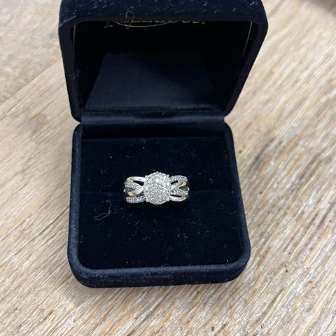 Teetetty valko/keltakultainen sormus 585 14k, neljällä kivellä. Keskellä valkokultaa ja reunoilla keltakultaa. Paino 4,4g, Koko 15,5. Kaiverrus.