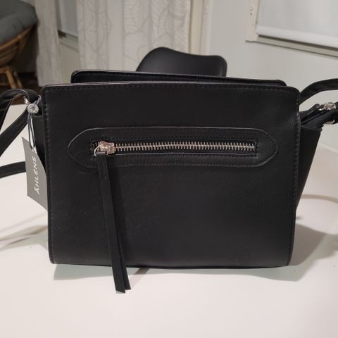 Vaaleanpunainen pikkulaukku. Merkki Åhlens. Laukun päällinen on keinonahkaa, hihna on metallia. Koko 19 x 11 cm, hihnan pituus 105 cm. Pinnalta ja sisältä erittäin siisti ja hyväkuntoinen. Hihnasta on paikoittain kultainen pinnoite hieman kulunut (kuva).