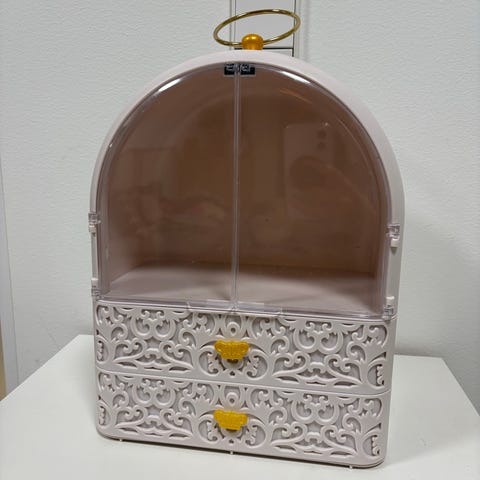 Kaunis kalenteriaihio, jossa on säilytetty koruja ja ompelutarvikkeita. Noin 16x34x37 cm. Postitus (11e) tai haku.