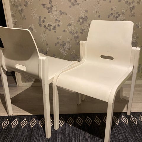 Joidenkin tuolien verhoiluissa on lieviä tahroja, mutta yleisilme hyvin siisti. Muutama ruuvi puuttuu myös.