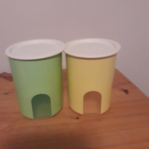 Kolme erilaista purnukkaa. Käyttöön esim. juomamuki retkelle, säilytys rasia puolikkaille hedelmille tai sipuleille ja omatekoisella salaattikastikkeelle.