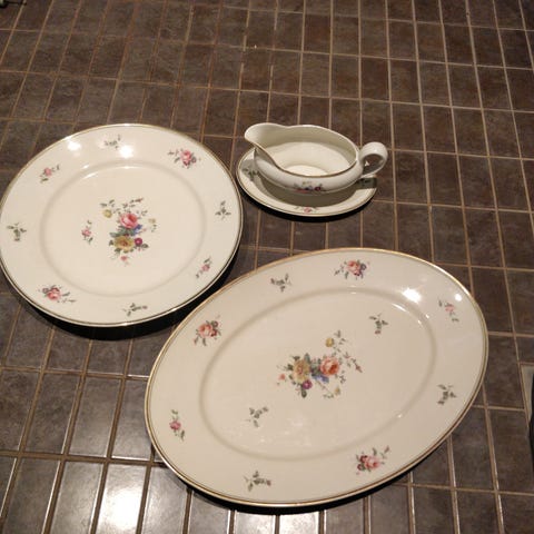 Arabian 1940-luvun tuotantoa oleva Anneli sarjaa. Piippuleima. Suunnittelija Olga Osol, malli AX, jossa kukkakuvio. Setti sisältää sältää 9kpl kaukkulautasia, 9 tassia ja 4 kahvikuppia. Väri pääosin valkoinen, koristeltu vaaleanpunaisilla ja punaisilla kukkakuvioilla. Materiaali posliinia. Lautasissa pieniä kolhuja ja krakelointia, käytössä ollut sarja jossa käytönjälkiä.