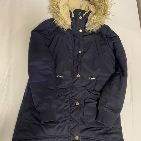 H&M tummansininen parkatakki / talvitakki, huppu neppareilla kiinni, vyötäröllä kiristysnauha, koko 152 cm, siisti käytetty, ei jälkiä tai kulumaa.