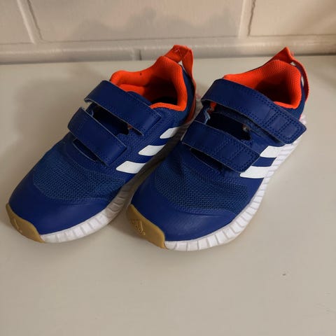Adidas lasten unisex lenkkarit sisäkäyttöön, koko 32. Kengät ovat siniset ja valmistettu hengittävästä materiaalista. Kiinnitys tarranauhalla.