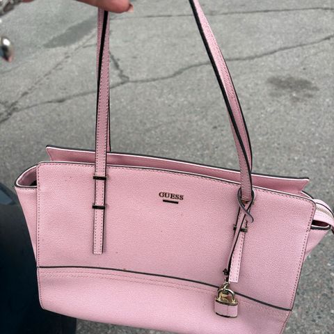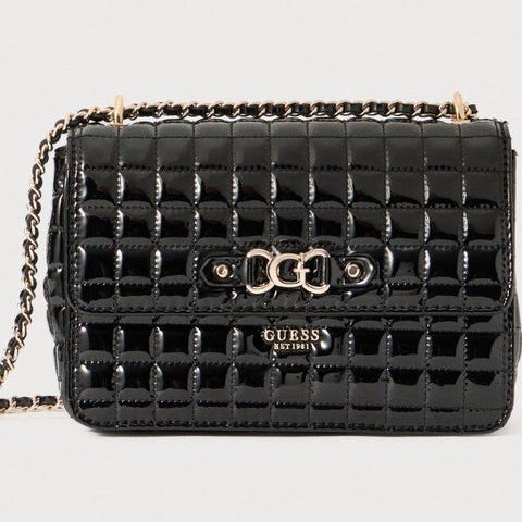 Yksi päätasku vetoketjulla, läppä edessä ja vetoketjutasku läpän alla, sisällä vetoketjutasku ja avotasku. Säädettävä ketju-/nahkahihna, vaalea vuori GUESS-logokuvioinnilla. Koko noin 24 × 17 × 8 cm.
