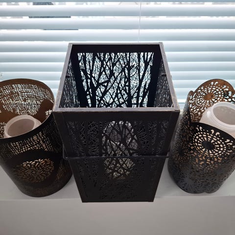 Tosi kauniit valkoiset talomalliset lyhdyt, peltiä, maalattu. Ei täydellinen maalipinta, mutta siisti. Pikkaisen rouheat. Sisäkäyttöön. Maalaisromanttiset, country-tyyliä, avartavat, sisälle mahtuu pienempi tai isompi kynttilä. Korkeus 31,5 cm, leveys räystäiden kohdalta 18,5 cm ja rungon osalta n 15 cm x 15,5 cm. Myydään mielellään yhdessä. Hinta yhteensä 10 euroa, eli 5 euroa / kpl.
