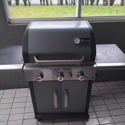 Landmann Rexon 3.0 gas grill with three burners in black color. The grill has a thermometer in the lid and stainless steel side plates. Gas bottle (half full), hose and protective hood included. Instructions included.
