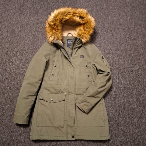 Muutamasta napista ilmeisesti ruostetta/väriä takissa. Hupussa ollut karva, ei tallessa.