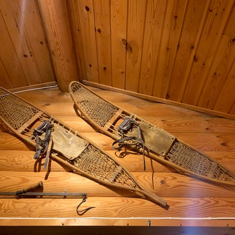Perinteiset lumikengät, joissa on puinen kehys ja nahkahihnat. Pituus 100cm, leveys 35cm. Voin postittaa.