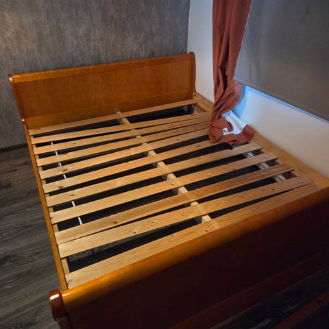Laitojen korkeus säädettävissä matalammaksi. Sängyn leveys 162 cm ja pituus 209 cm.