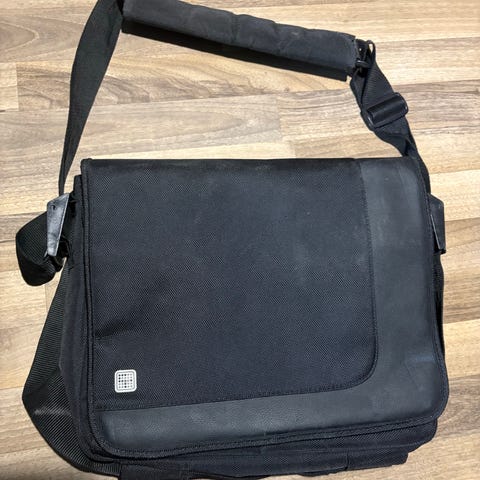 Ollut lähinnä hyllyllä pölyttymässä. Vetoketjun väri on vähän kulunut mutta muuta kulumaa ei ole. Olkanauha puuttuu. Mitat 40x34x10cm. Korkeusmitta ilman kahvaa.