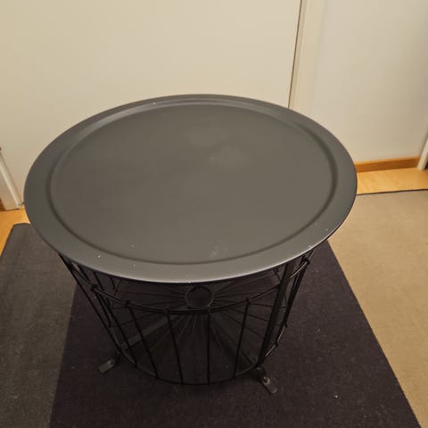 Halkaisija 50cm, korkeus 40cm. Käytetty sivupöytänä. Mukaan saa halutessaan lasiliikkeessä leikatun pyöreän lasilevyn, jota on käytetty korin päällä. Lasin halkaisija 55cm ja korkeus n.8mm. Levy on ehjä, mutta siinä näkyy käytön jälkiä.