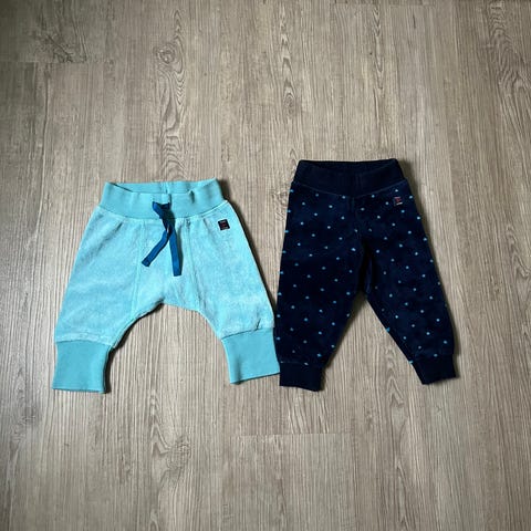 Siniset veluurihousut. Pehmeät ja mukavat. Joustava resori vyötäröllä, jota voi säätää naruista. Erityispitkät resorit lahkeensuissa voi taittaa ylös tai alas lapsen kasvaessa.