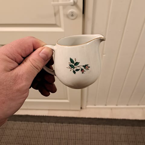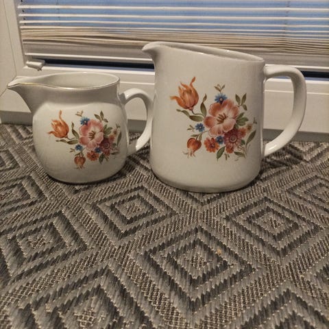 Arabian Irja-sarjan kannu, kermanekka ja sokerikko. Yläreunan kultaus haalistunut ja paikoin kulunut pois. Muutoin hyväkuntoiset. Savupiippuleima pohjassa