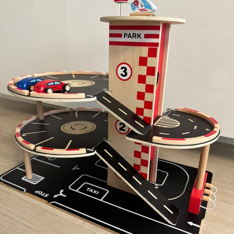 Hieno puinen kaksikerroksinen parkkitalo. Paljon puuhaa pikku autoilijalle. Korkeus hissitornin kanssa 40 cm. Leveys 54 cm ja syvyys 38 cm. Täysin ehjä ja muutenkin hienossa kunnossa. Myynnissä Lohjalla, mutta kulkeutuu ilman postikuluja omien menojen mukaan Kamppiin, Espoon Ikealle tai Espoon keskukseen. Hp. 30 euroa
