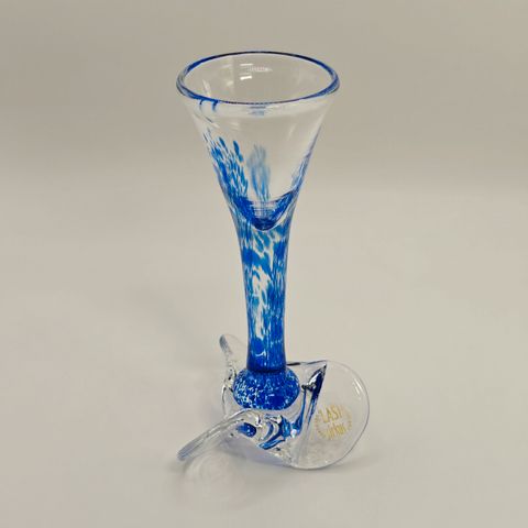 Kokoelma kahdeksan värillistä lasista snapsilasia, joissa on koristeellinen varsi ja jalka. Lasit ovat erivärisiä ja sopivat esimerkiksi juhlakäyttöön tai kokoelmiin.