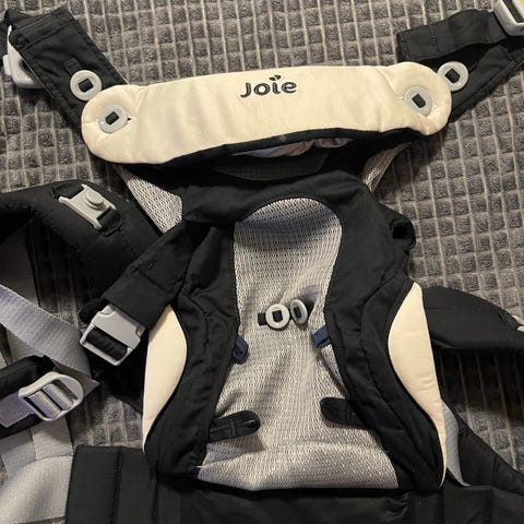 Joie-merkin ergonominen Savvy-kantoreppu, joka on valmistettu miellyttävästä ja hyvin hengittävästä materiaalista. Siinä on yksinkertaiset kiinnikkeet ja mukava, suojaava huppu aurinkoisia päiviä varten.