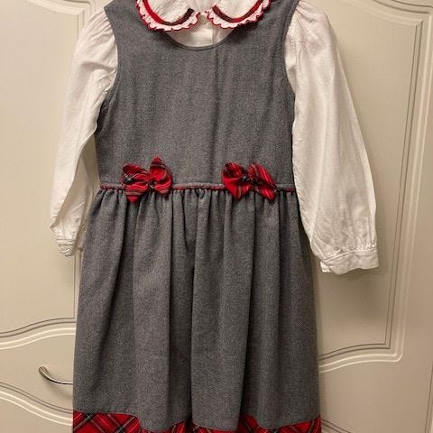 Villainen lämmin joulumekko, jonka yläosassa edessä punaisia paljetteja ja takana neppakiinnitys (ks kuvat). Itse tehty 80-luvulla, ei kokomerkintää mutta kuvissa mitat (arviolta 110-116 kokoiselle).