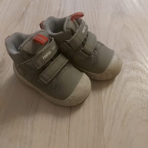 Käytettynä ostetut ja todella paljon käytetyt Reiman välikausikengät. Koko 22. Nämä ovat jo parhaat päivänsä nähneet. Edessä kärjessä lohkeama (ks. kuva). En siis takaa kengille enää vedenpitävyyttä. Ei pesty. Pesu jää ostajalle. Näissä on ulon tuoksu.