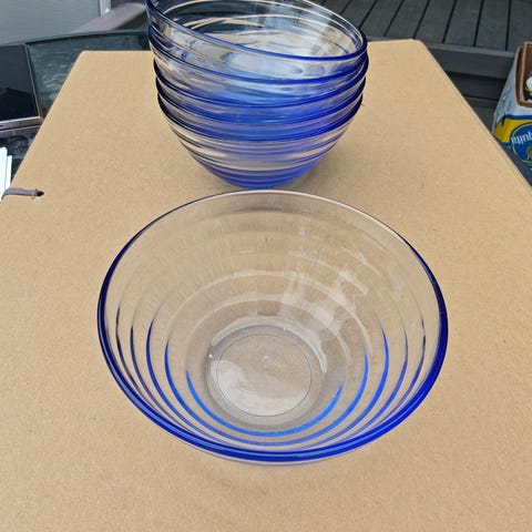 Myydään tarpeettomina vihreät lasiset tarjoilukulhot. Yksi isompi ja neljä pienempää jälkiruokakulhoa. Merkistä en ole varma. Täysin ehjät, ei halkeamua.